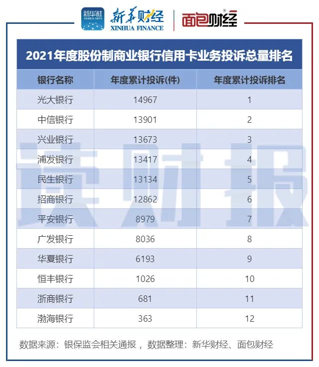 2021年全年,光大银行、中信银行、兴业银行分别位居银行信用卡业务累计投诉量前三甲。