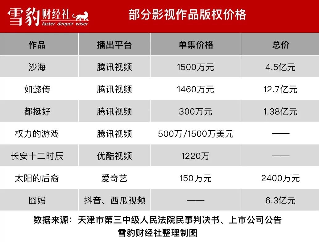 在腾讯的版权购买史上,30万/部的价格也属“羽量级”。腾讯视频起诉某盗播视频软件的裁判文书显示,腾讯在购买电视剧《沙海》时,单集价格便达1500万元,总价4.5亿元。更遑论《权力的游戏》这种已被海外市场验证过的作品。文书显示,腾讯在购买《权力的游戏》第八季时,单集价格便达1500万美元,约合近1亿人民币。