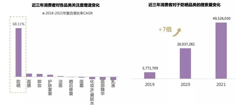 近年来,消费者对防晒的关注度不断增长,防晒意识普遍增强。比如,据美丽修行大数据显示,2019年至2021年,消费者对防晒品类的搜索量从577万次上升到4953万次,提升了7倍。