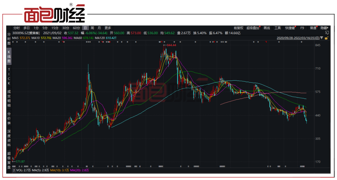 近日,爱美客发布2021年年报。与公司翻番业绩不相符的是,爱美客股价自去年下半年以来一路震荡下跌。截至3月17日收盘,爱美客的股价较去年高点跌去了超40%,市值蒸发近逾800亿元。