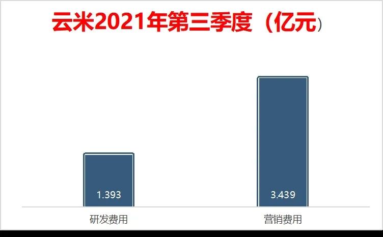 到了2021年第三季度,云米的营销费用为3.439亿元,研发费用为1.393亿元,前者为后者的2.47倍。