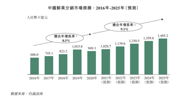 以水果分销行业为例,灼识咨询统计的数据显示,2020年品牌化率达到30%,预计到2025年将上升至50%左右。前面提到的洪九果品正深耕该赛道,也是百果园之外,另一个可能冲击“水果第一股”的热门选手。