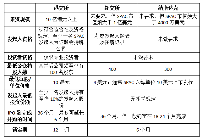 与美国SPAC相比,中国香港的SPAC上市制度更加严格。比如港交所规定赴港SPAC上市筹资规模至少为10亿港元(约合1.3亿美元),而纳斯达克的最低市值要求为5000万美元,纽交所为1亿美元。