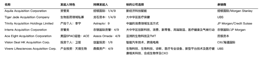 这9家SPAC公司均聚焦新经济行业,涉及绿色能源、生命科学、先进科技与制造行业、医疗健康、全球性消费等领域,而且发起人实力雄厚,个个都来头不小。比如Trinity的发起人有“体操王子”李宁、莱恩资本以及Astrapto;Interra的发起人有春华资本、农银国际资管;Vision Deal HK的发起人,则包括阿里巴巴前CEO、嘉御基金创办人卫哲。