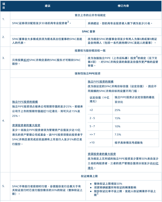 不过,为避免制度过于繁琐,提高本港SPAC制度的灵活性和吸引力,提高上市效率,港交所在正式文件中对上市规则做了微调,放松了一些规定,包括降低机构投资者人数要求,取消投票与赎回一致的要求等。