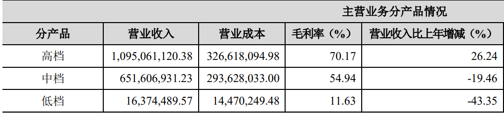 金徽酒产品结构更是出现了此消彼长的状况。2021年,公司中、低档酒销售额分别为6.52亿元和1.64亿元,同比分别下滑19.46%和43.35%。在不断提升百元以上酒销售额的同时,金徽酒却在丢失原有的百元以下酒市场份额。