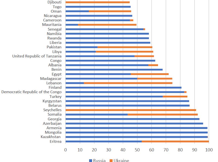 联合国粮农组织统计显示,对俄罗斯和乌克兰小麦依赖度最高的国家主要位于非洲、中亚和中东地区,其中大部分为低收入和发展中国家。非洲之角国家厄立特里亚对俄乌小麦的进口依赖度高达100%。
