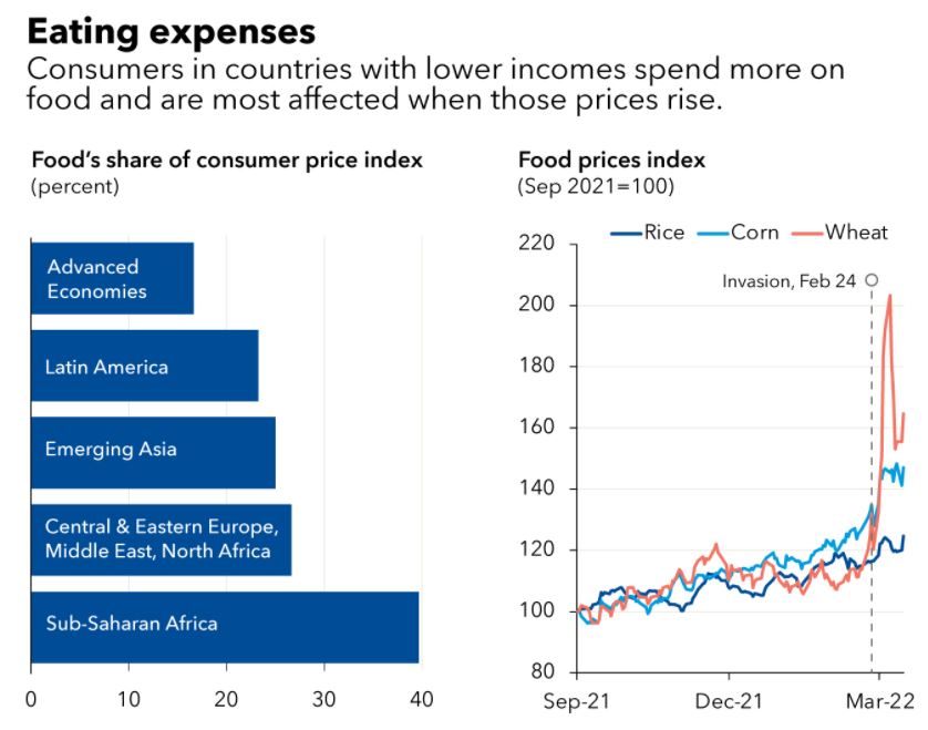 国际货币基金组织(IMF)周四也发出类似警告。IMF指出,随着俄乌战争推高全球食品价格,食品开支在消费支出中占比高的家庭承受的冲击将更大。在发达经济体中,食品支出在消费支出中的占比约为17%,在撒哈拉以南非洲则占到40%。