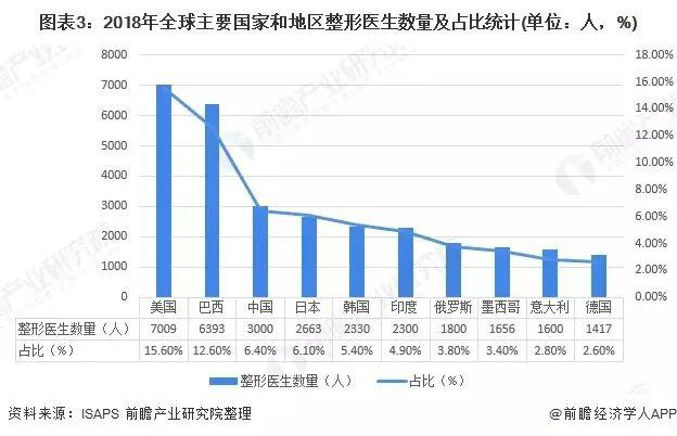 根据ISAPS报告,中国整形医生数量位于全球第三位,但是与排在前两位的美国与巴西相比仍有一定差距,巴西整形医生数量是中国的两倍多,美国是中国的三倍多。与中国国庞大医疗美容市场需求相比,中国专业的整形医生数量仍有较大缺口。