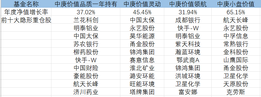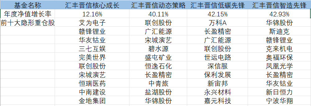 具体到四只基金的隐形重仓股,可以看到,因为四只基金的投资主题不同,隐形重仓股的名单也并不完全一致。