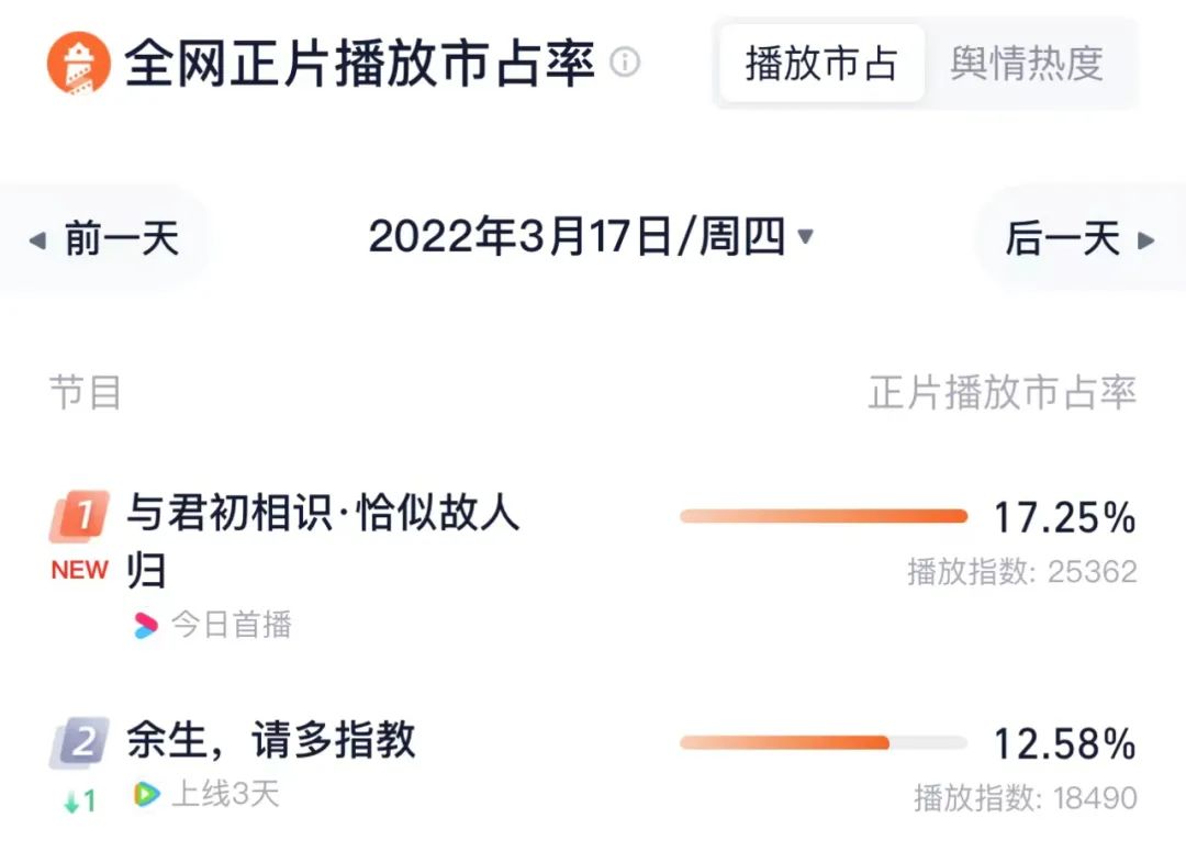 《余生》《与君初相识》的开局高热,说明了爱情剧的主演阵容选择依旧是最重要的环节,它有时甚至能够凌驾于内容优劣之上。当然,离不开的还有一个足够火热的IP与头部主演相得益彰。必须承认,尽管“流量+大IP”的爆款公式曾经数次失灵,但它也至今仍在奏效。