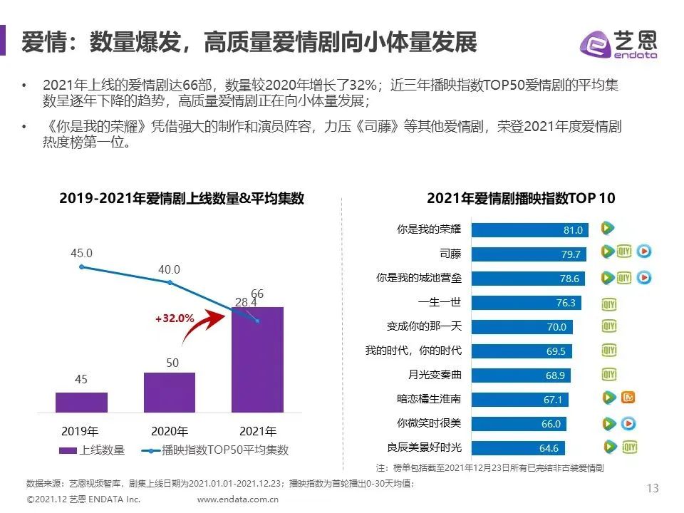 根据艺恩数据《2021年国产剧集市场研究报告》,在2019年至2021年三年间,爱情剧上线数量连年攀升,其中2021年全年达到了66部。