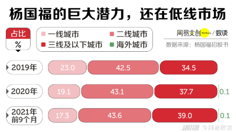 营收数据也是同理,杨国福的二线及以下城市的营收额占到了总营收的近七成,越是下沉市场,杨国福的营收越高。