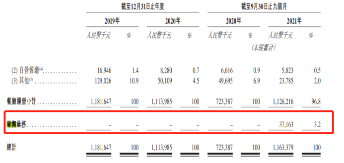 在2021年,杨国福声称为了应对疫情的线下影响,于是做起了零售业务。根据招股书数据,零售业务在2021宗营收中占比3.2%。