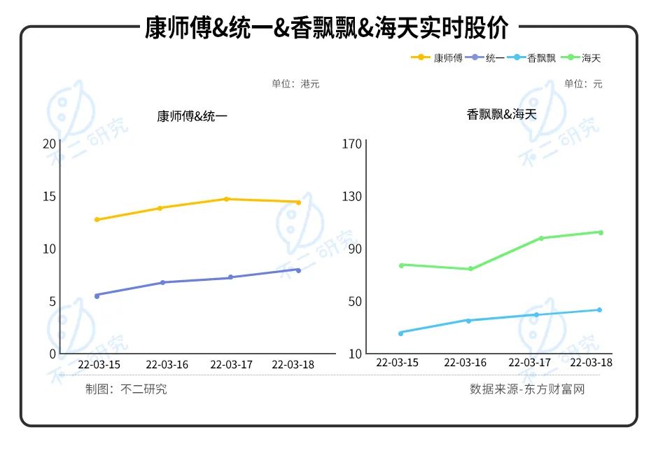 截至3月18日收盘,康师傅股价报14.10港元/股,跌0.14%;统一报6.98港元/股,跌0.58%;香飘飘报13.35元/股,涨0.23%;海天味业报92.4元/股,跌0.98%。