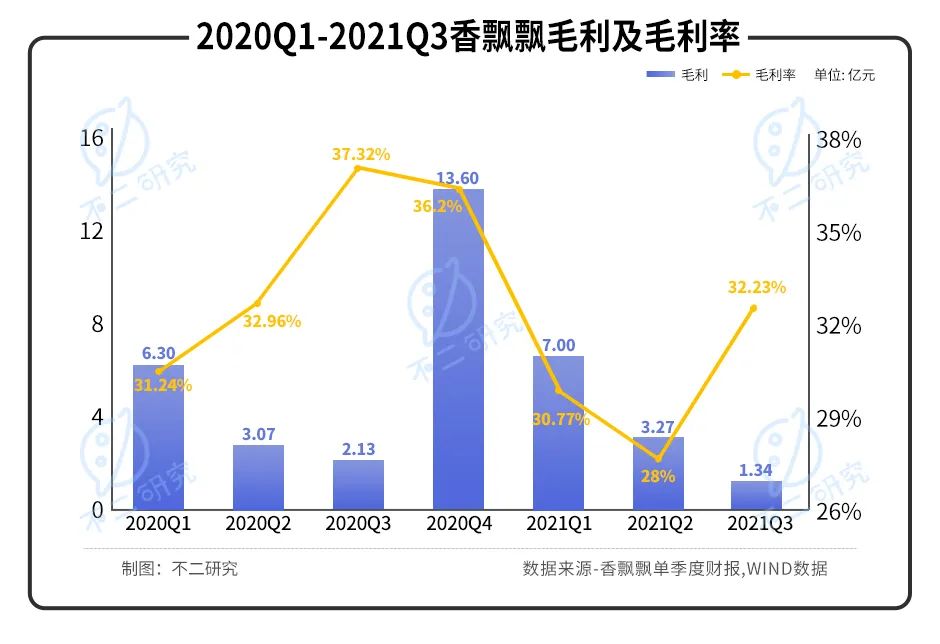 从毛利率来看,香飘飘也处于逐年下滑的颓势中。财报显示,2021年前三季度香飘飘的毛利率32.23%,同比减少4.44%;从各项细分业务来看,2020年年报显示,其冲泡奶茶类的毛利率同比减少4.72%,即饮类的毛利率同比下滑12.5%。