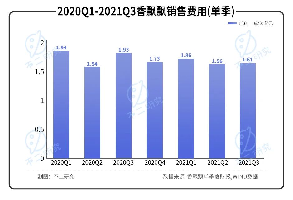 与此同时,销售费用却居高不下。财报显示,2021年前三季度,香飘飘的销售费用为5.02亿,占营收的25.43%。