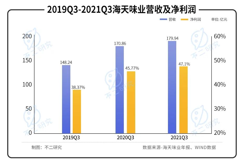 以“酱茅”海天味业为例,财报数据显示,2021年年三季度,海天味业实现营业收入179.94亿元,同比增长5.32%;净利润为47.10亿元,同比增长2.89%。营收利润虽然双增,但业绩增速仅为个位数,同比大幅下滑,远远低于往年15%左右的平均水平。