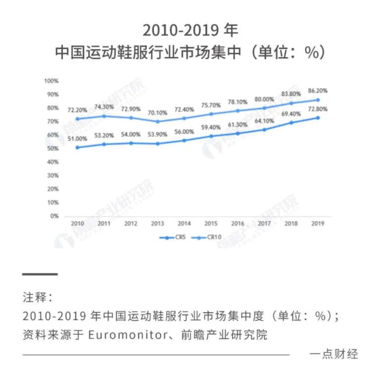 依照前瞻产业研究院数据来看,运动鞋服市场看上去依然很美。但蓬勃市场的另一面则是血腥残酷的“红海”,头部公司集中度越来越高。数据显示,运动鞋服行业CR5/CR10分别从2010年的51%、72.2%增长至2019年的72.8%、86.2%。