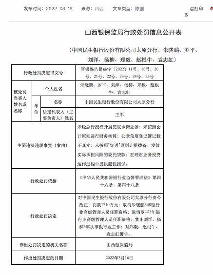 与此同时,有7名相关负责人一同被罚,包括原民生银行太原分行行长朱晓鹏和原民生银行太原分行副行长罗平。