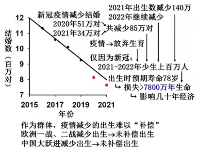 根据民政部的每年的统计季报,2016年、2017年、2018年、2019年的结婚数分别为1133万对、1059万对、1011万对、926万对。易富贤特别指出,如果没有疫情,根据线性下降的公式推算2020年、2021年结婚数应分别为864万对、797万对;而疫情导致结婚数减少,2020年、2021年实际结婚数只有813万对、764万对。这意味着疫情导致2020年、2021年结婚分别减少51万对、34万对,合计减少85万对。加上很多人放弃生育,疫情导致2021年、2022年少出生上百万孩子。