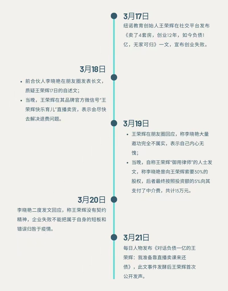 这场持续数日的骂战,起源于3月17日一篇题为《卖了4套房,创业12年,如今负债1亿,无家可归》的文章。纽诺教育创始人王荣辉在文中称,为了创业,前后卖掉4套房,倾尽所有,并表示自己仍旧在岗,不会跑路。