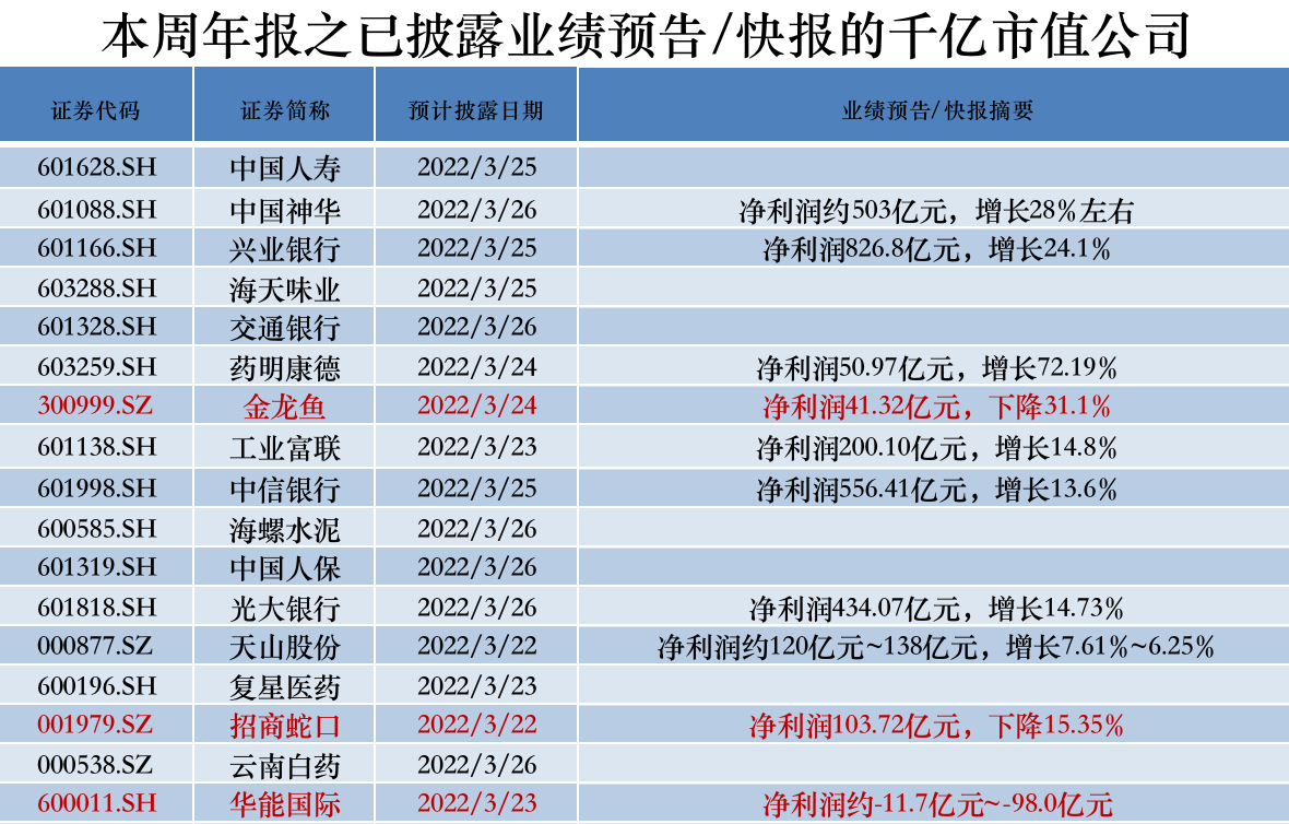 将披露年报的千亿市值公司多达17家,主要集中在银行、保险、医药生物、建筑材料等板块。包括兴业银行(601166.SH)、交通银行(601328.SH)、药明康德(603259.SH)、复星医药(600196.SH)、海螺水泥(600585.SH)、天山股份(000877.SZ)、海天味业(603288.SH)、工业富联(601138.SH)等。