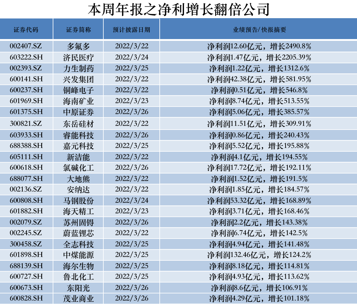 剔除扭亏公司,本周将披露年报的公司中预计净利润增长翻倍的公司有24家。多氟多(002407.SZ)、济民医疗(603222.SH)、力生制药(002393.SZ)3家公司预计净利润增长超过10倍。从板块来看,化工、电子、医药生物板块增长领先,分别有6家、5家、4家公司出现在榜单中。