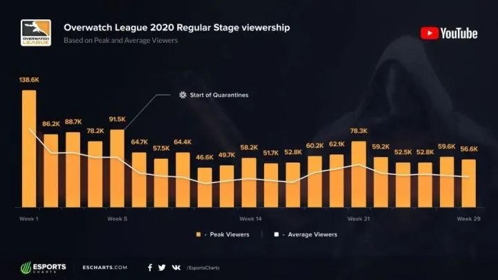 不仅CS:GO,守望先锋职业赛事也难逃收视率下滑的命运。北美作为守望先锋最重要的电竞市场之一,在2020年却难见动视暴雪给出的任何收视数据,只能在第三方数据统计机构Esports Charts上进行了解。