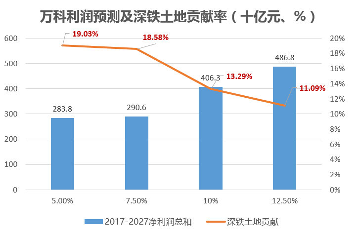 如果这期间万科净利润增速仅为5%,则深铁集团注入土地在2017-2027年间产生的利润占万科期间利润总额的19.03%,十分接近20.65%的持股比例。但如果万科净利润增速保持在10%,则深铁集团的贡献率仅为13.29%。