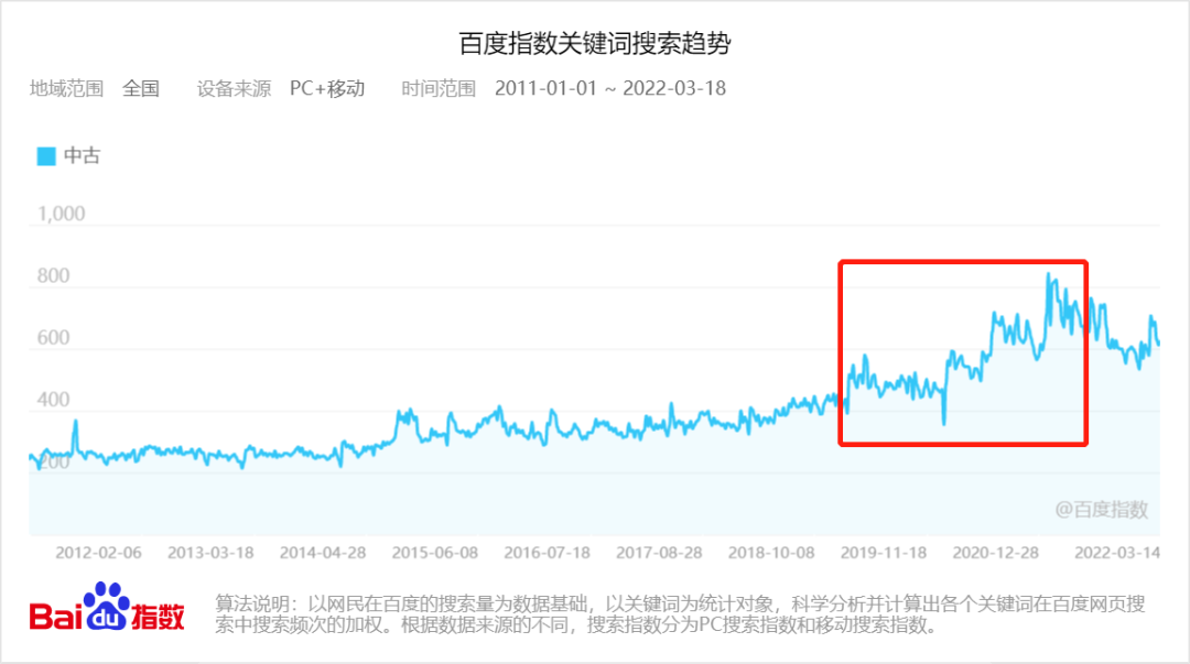 百度指数显示,“中古”一词的搜索趋势在近两年攀升