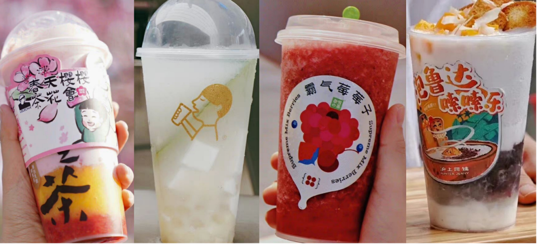 如眷茶的招牌草莓鲜橙茉莉,是将草莓和橙子结合;伏小桃的草莓长岛冰茶,仅是草莓+乌龙茶+寒天晶球的组合,在社交平台备受好评。
