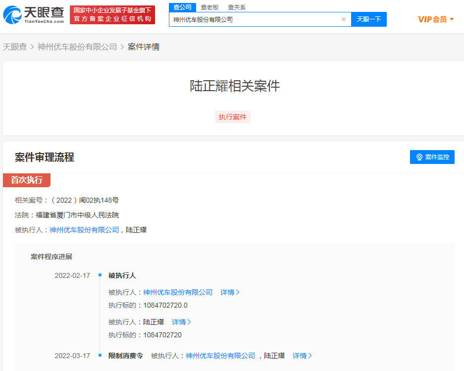 天眼查App显示,3月17日,神州优车股份有限公司新增一则限制消费令,限制消费对象为该公司及法定代表人陆正耀。该限制消费令涉及陆正耀相关案件,2月17日,陆正耀及神州优车股份有限公司被列为被执行人,执行标的10.84亿余元。