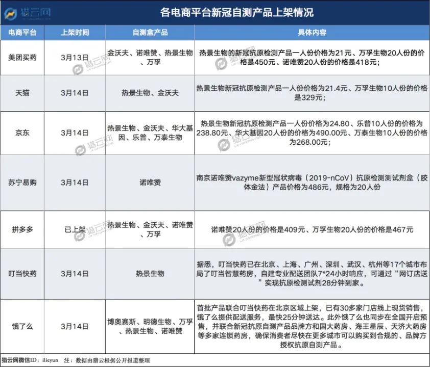 叮当快药、饿了么和平安好医生也不甘落后。3月14日叮咚快药携手热景生物上市首批新冠抗原自测试剂盒,将通过“网订店送”方式实现抗原检测试剂28分钟到家服务。平安好医生用户也表示即将上线首批新冠抗原自测试试剂盒,可在平安健康App中进行预约购买。