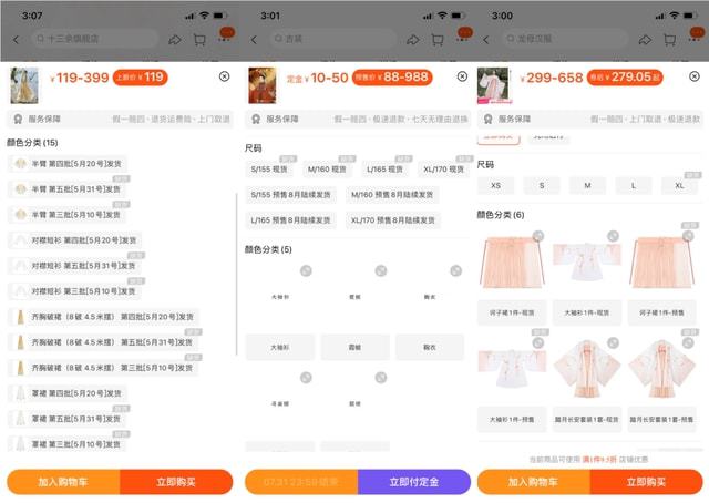 而现在,行业整体毛利压低,商家们更加不会选择去承担库存积压的风险。于是汉服长期只能是采用预售+尾款的模式,以销售量来反向决定生产量。