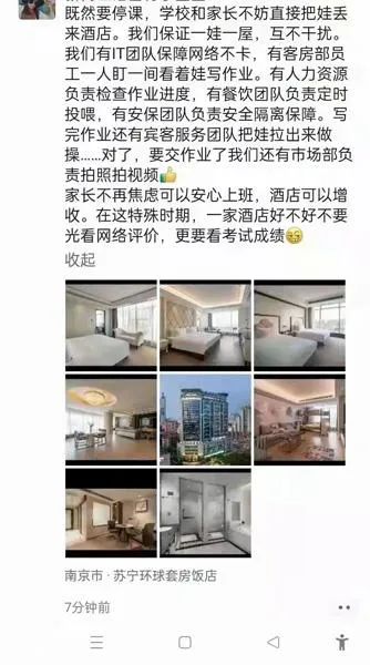 最先找出这一“商机”的是南京苏宁环球套房酒店。2022年3月16日起,南京全市中小学暂停线下教学。当天下午,酒店便发出了一条朋友圈:“我们有IT团队保障网络不卡,有客房部员工一人盯一间看着娃写作业;有人力资源负责检查作业进度,有餐饮团队负责定时‘投喂’,有安保团队负责安全隔离保障;写完作业还有宾客服务团队把娃拉出来做操……对了,要交作业了我们还有市场部负责拍照、拍视频。”