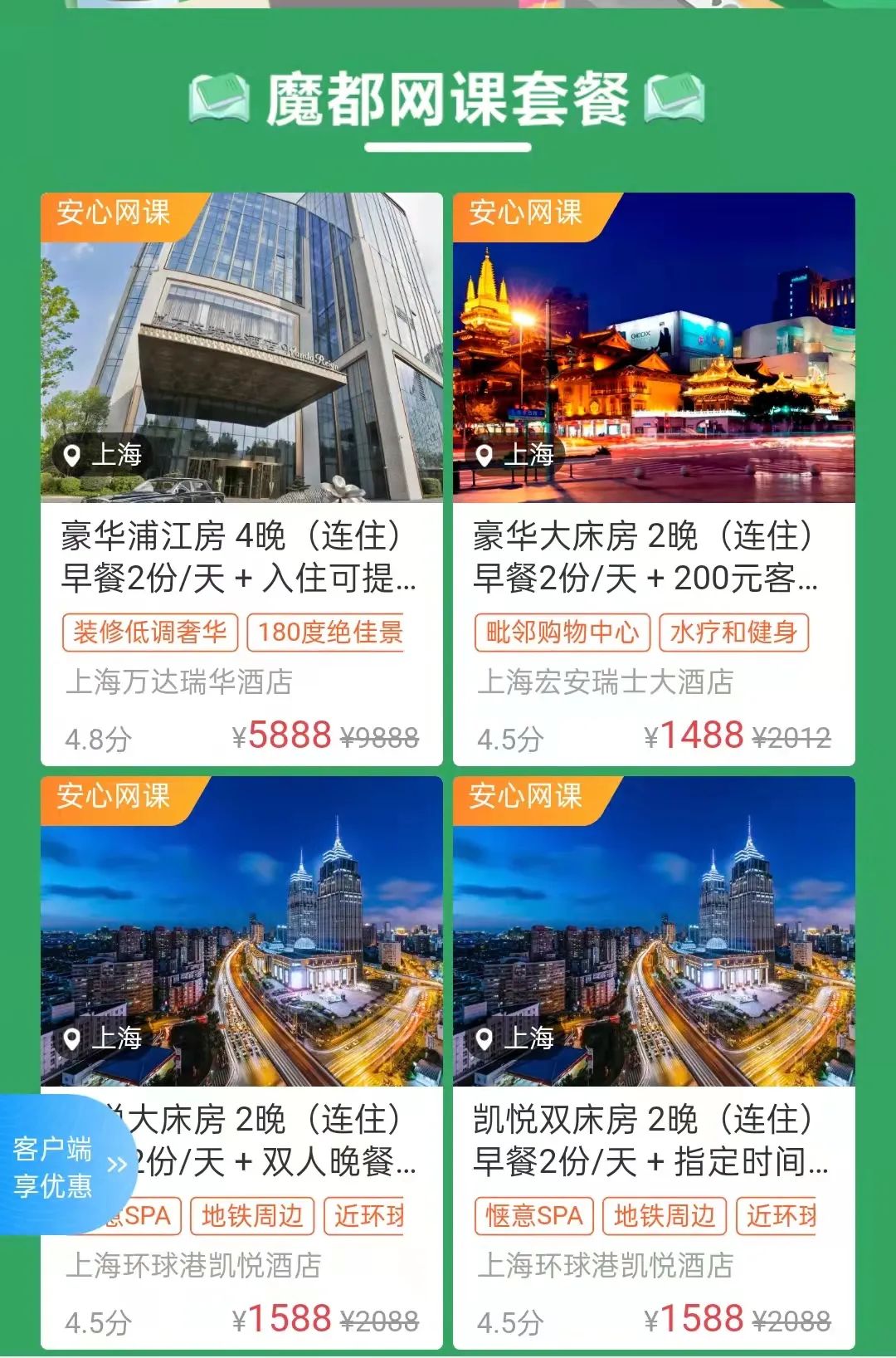 同期,“携程无忧网课房”活动在携程App悄然上线,上海地区的21家高星酒店的34个套房参与活动,价格在588元到11664元之间。从活动界面中可以看出,虽然提供了各式各样的附加服务,但参与活动的酒店大多提供了力度较大的价格优惠,减免金额从几百元到两千多元不等,优惠力度高达60%。“这类房间都是预售,加之现在疫情因素影响,其实比正常时期的客房价格还要便宜。”携程研究院战略研究中心副主任张致宁对新旅界(LvJieMedia)表示。
