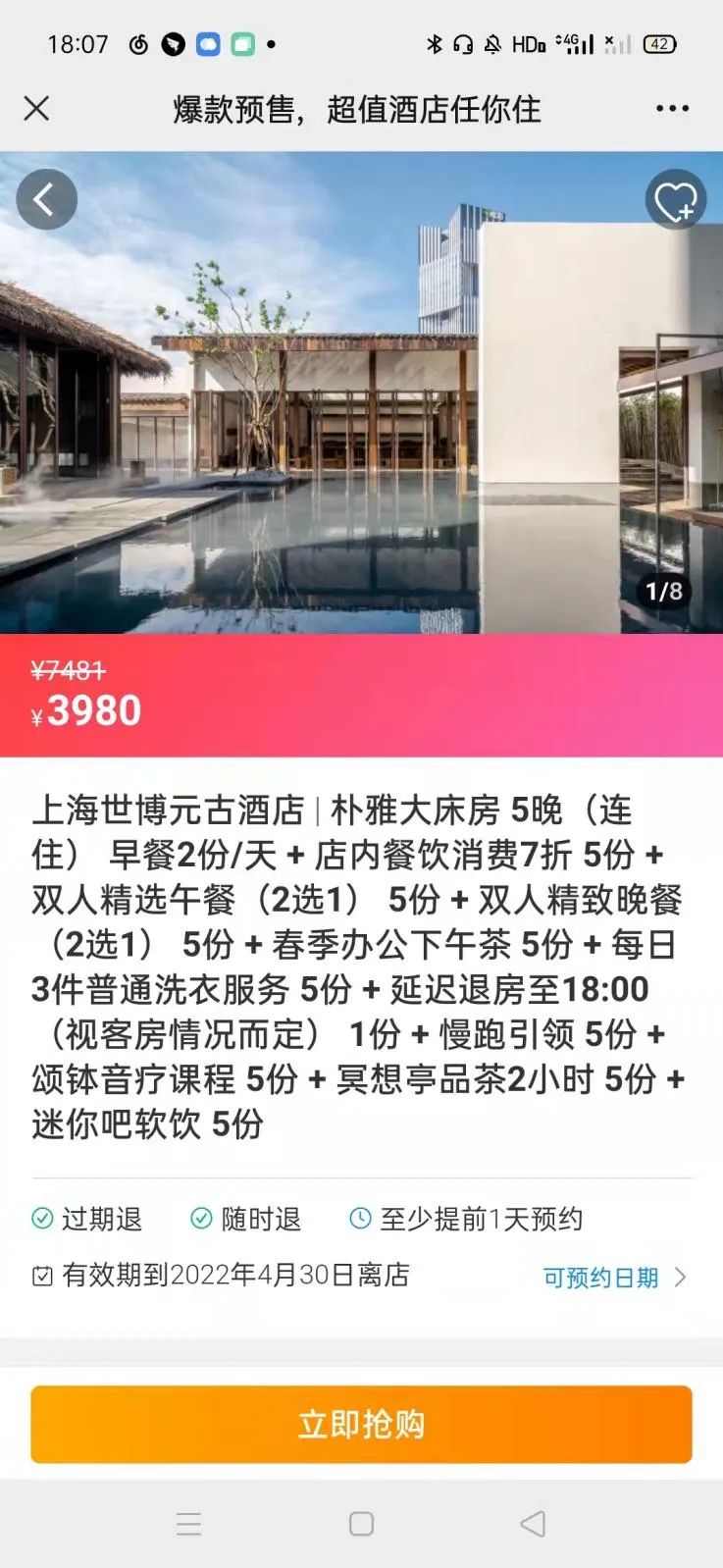 另外的酒店服务则虽然提供一定程度的学生监督服务,但其活动设置更倾向于照顾身心疲惫的“大人们”而非上课的学生。在上海世博元古酒店的预定界面上,写着提供“网课陪护”“慢跑引领”“颂钵音疗”“冥想厅品茶”和各类餐饮优惠。