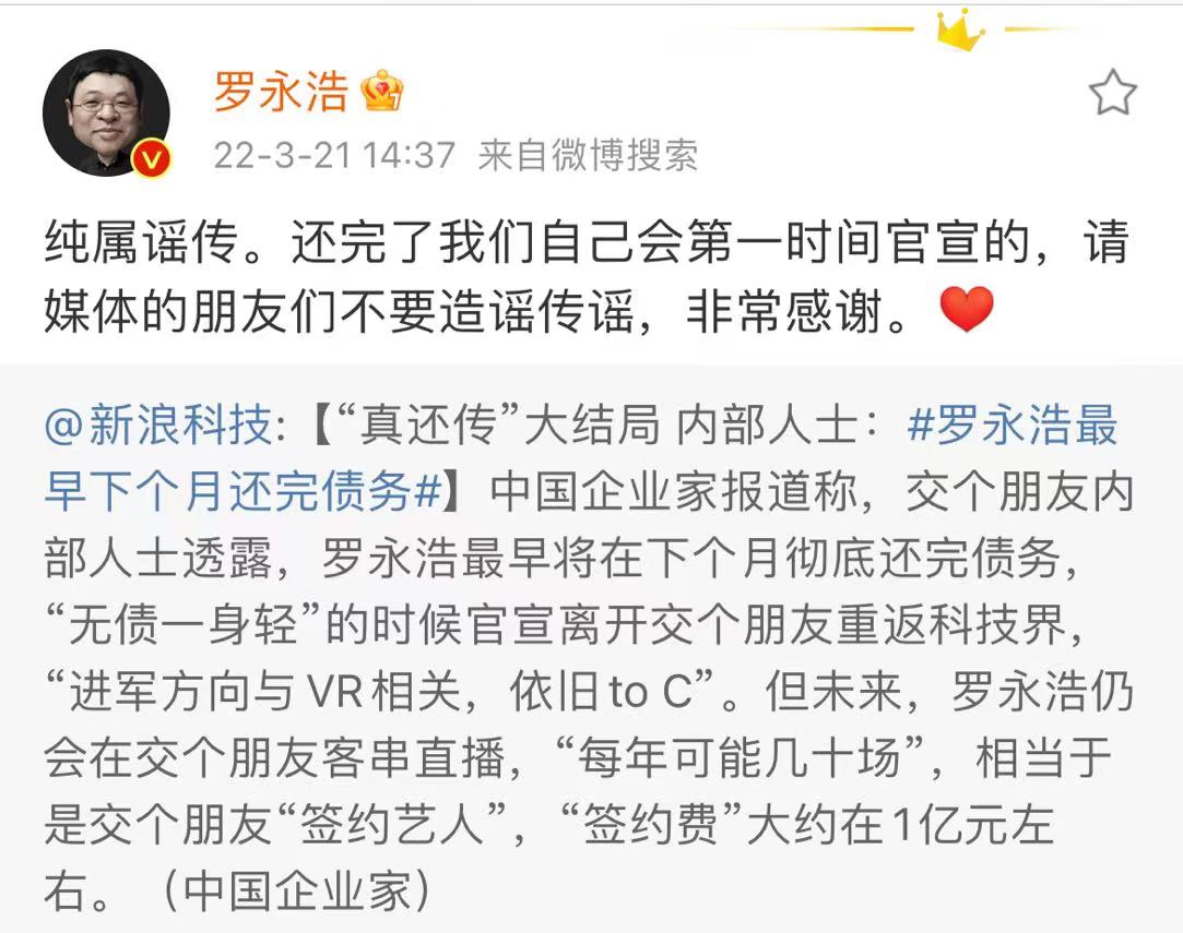 3月21日,针对有媒体报道称“罗永浩最早将于下个月彻底还完债务”的消息,@罗永浩 回应称:“纯属谣传,还完了我们自己会第一时间官宣的。”