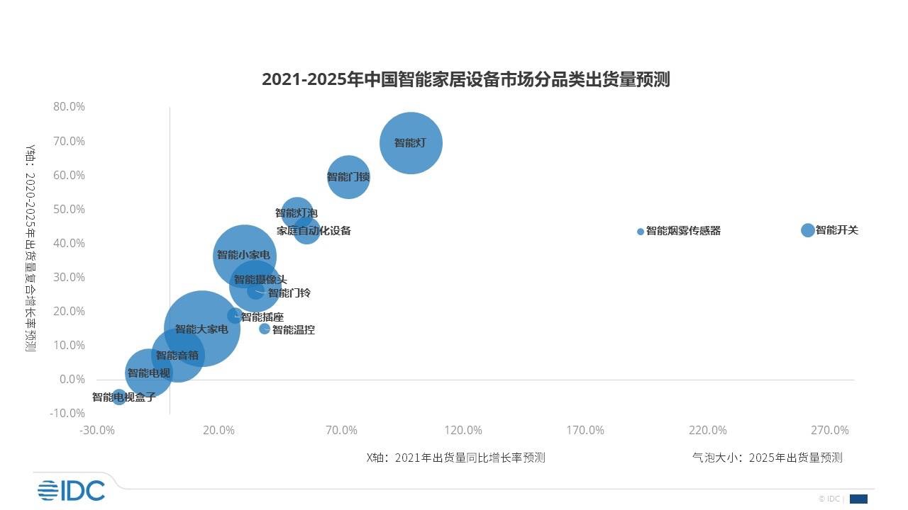 IDC预计,2021年全年我国智能家居设备出货量将达2.5亿台。同时,IDC预计未来五年中国智能家居设备市场出货量将以21.4%的复合增长率持续增长,到2025年,智能家居设备市场出货量将接近5.4亿台。我国智能家居市场呈现快速增长态势,全屋智能解决方案在消费市场的推广将成为市场增长的重要动力之一。