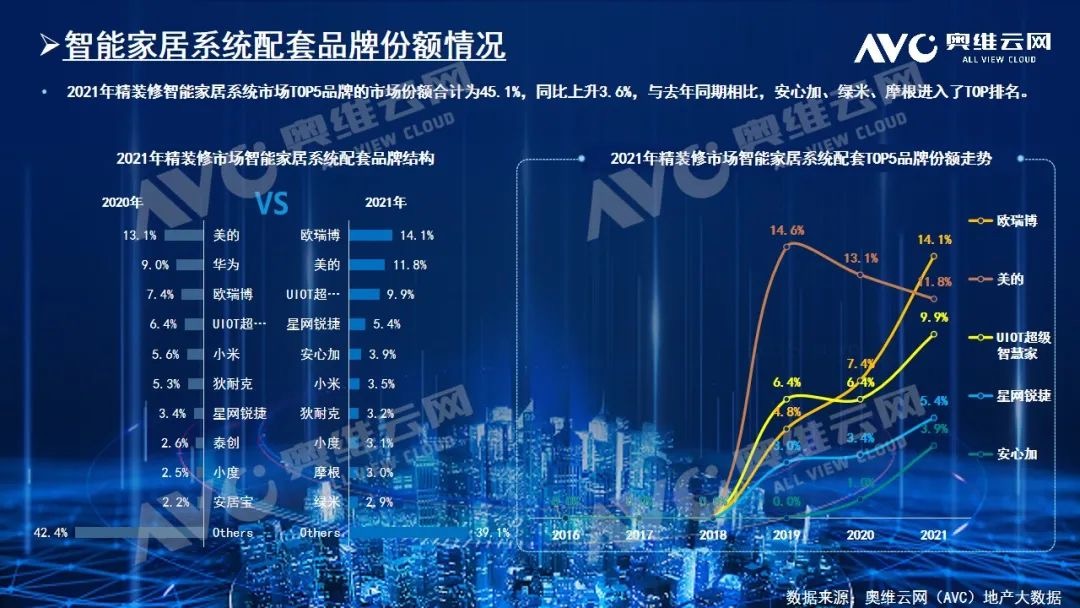 根据奥维云网在我国精装市场总结中指出,智能家居配套逐步提升。2021年精装修市场智能家居系统品牌竞争来看,TOP10品牌份额为60.9%,其中欧瑞博2021年在工程端持续发力,市场占比14.1%,跃居市场首位,其次为美的、UIOT超级智慧家。