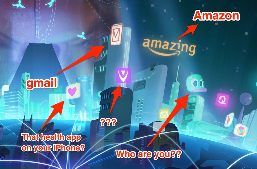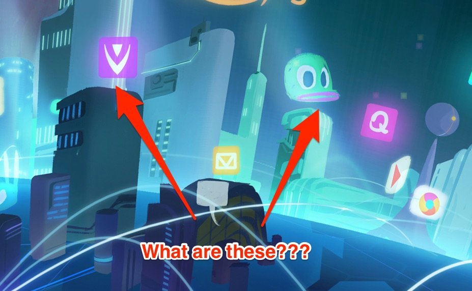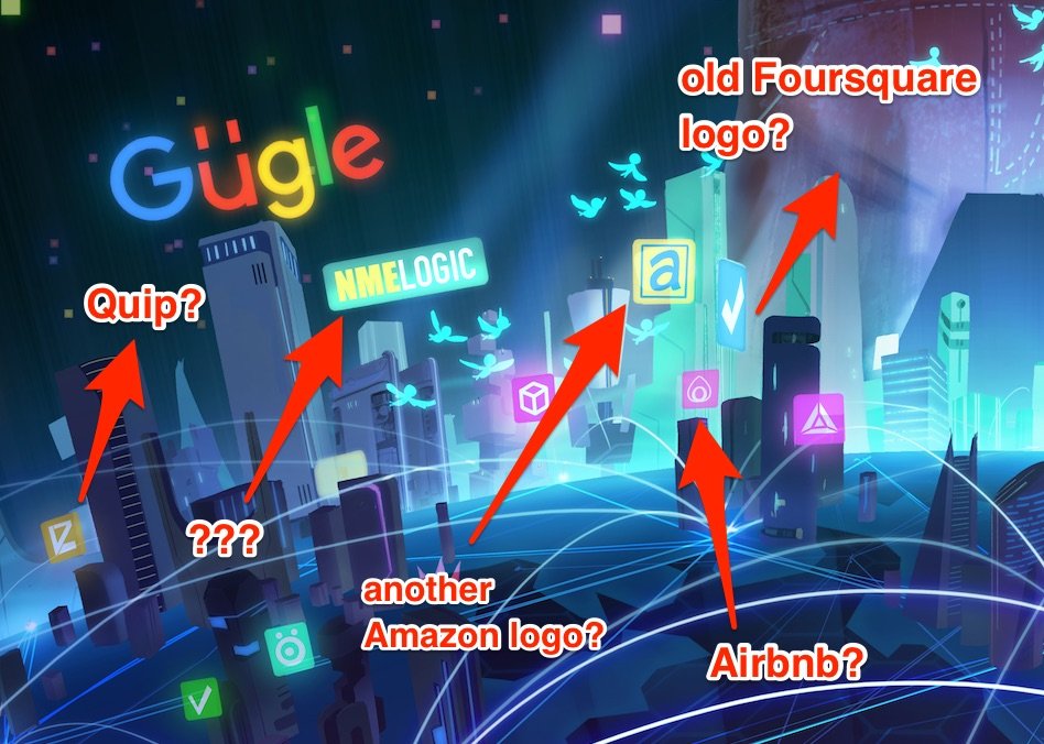 视线拉远一下,我们能看到右上角有一只蓝色的对勾,似乎是签到网站Foursquare的早期Logo?旁边那只“a”图标好像也与亚马逊有些相像。下方的粉红图标模仿的应该是Airbnb的Logo吧。Gügle下方的,是小组协作办公应用Quip吗?
