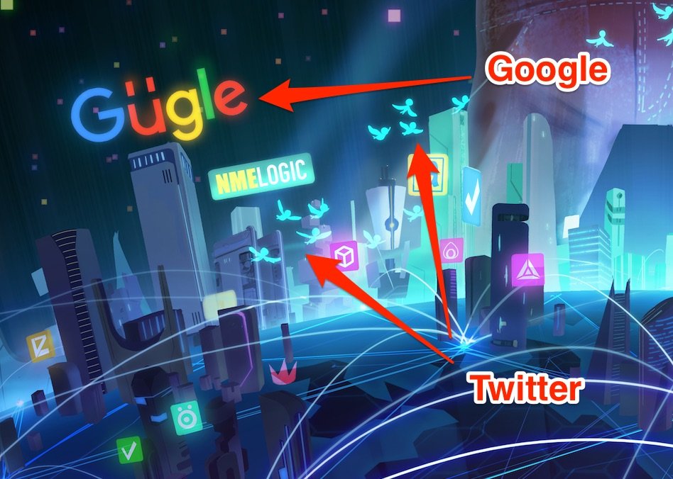先从简单的开始,最明显的便是换了个读音的Gügle,楼宇间飞翔的几只小鸟想必代表的就是Twitter了。