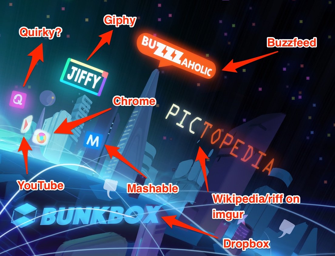还没完呢!动图搜索引擎Giphy变成了发音相似的Jiffy,网络存储服务Dropbox变成了Bunkbox。Pictopedia听起来像是维基百科(Wikipedia)遇上了图片网站Imgur。瞧,还有新闻网站Buzzfeed和Mashable。Youtube和Chrome紧紧挨在一起,似乎擦出了火花?