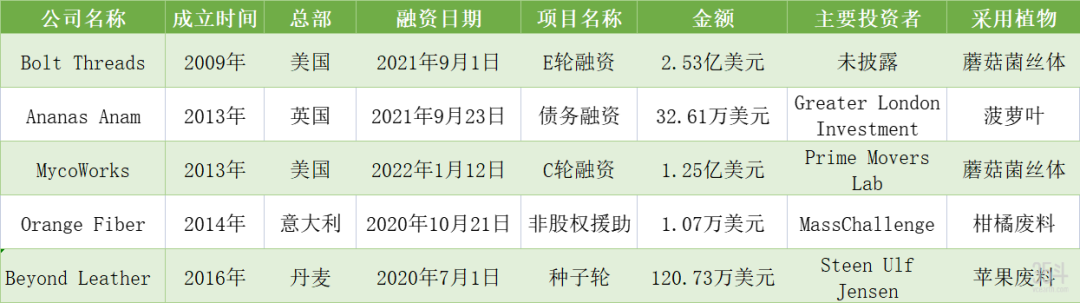 表2:植物皮革初创公司融资情况(部分),数据来源:据Crunchbase整理
