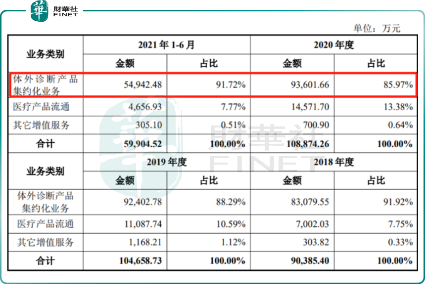 2020年合富中国实现营收10.88亿元,其中体外诊断产品业务收入9.36亿元、占比85.97%,医疗产品流通业务收入1.46亿元、占比13.38%,其他增值服务收入700.90万元、占比0.64%。
