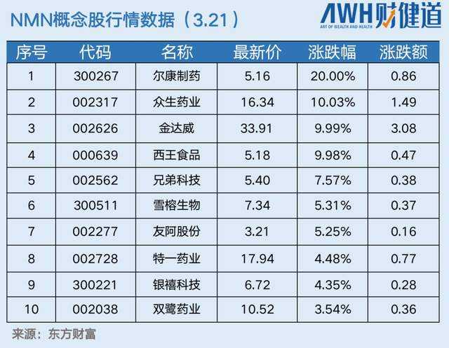 近日,多个NMN概念股呈持续上扬之势,3月21日收盘数据显示,尔康制药(300267.SZ)涨20%,众生药业(002317.SZ)涨超10%,康惠制药(603139.SH)、西王食品(000639.SZ)等跟涨。
