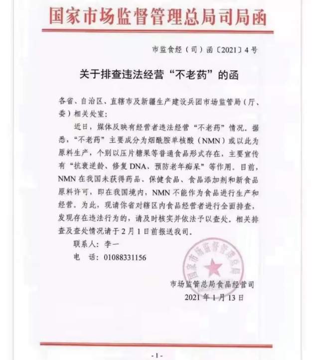 然而,早在一年多以前,国家市场监督管理总局曾下发《关于排查违法经营“不老药”的函》(市监食经(司)函〔2021〕4号),明确禁止NMN在我国境内作为食品进行生产和经营,并强调指出,目前,NMN在我国未获得药品、保健食品、食品添加剂和新食品原料许可。