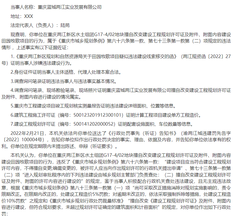 行政处罚决定书显示,蓝城两江实业在重庆两江新区水土组团G17-4/02地块擅自改变建设工程规划许可证及附件、附图内容建设田园牧歌项目的行为,属于违法建设。