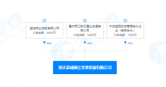 据天眼查APP股权穿透图显示,蓝城两江实业由三家企业共同持股。分别是蓝城伟业控股有限公司持股46%,重庆两江新区置业发展有限公司持股44%,宁波蓝西投资管理合伙企业(有限合伙)持股10%。